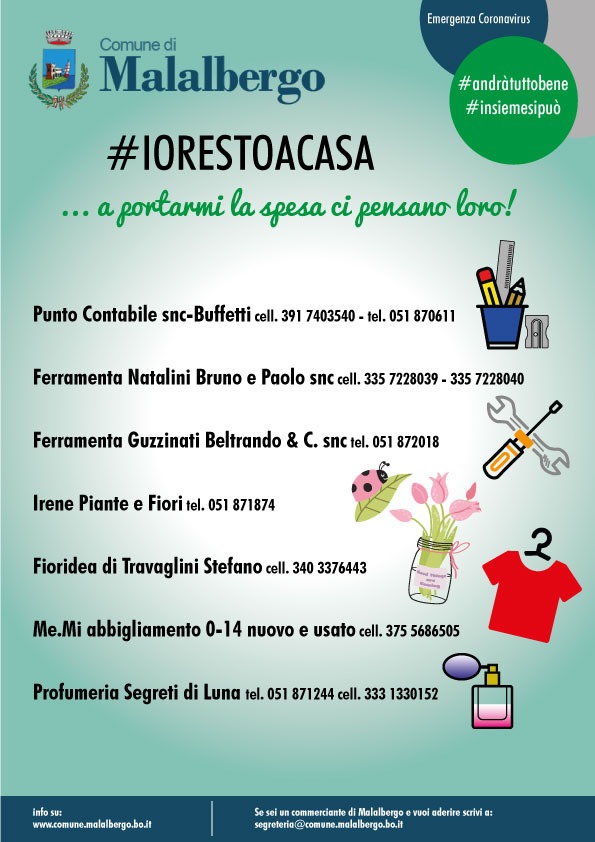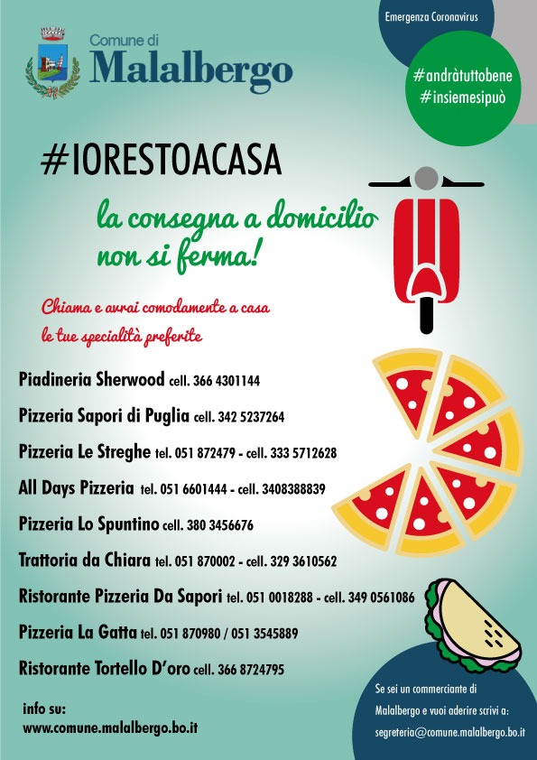 Viste le misure di contrasto e contenimento del nuovo coronavirus che sospendono diverse attività commerciali e limitano gli spostamenti, segnaliamo l'elenco delle attività presenti a Malalbergo che sono disponibili a consegnare a domicilio i propri prodotti e le proprie specialità.