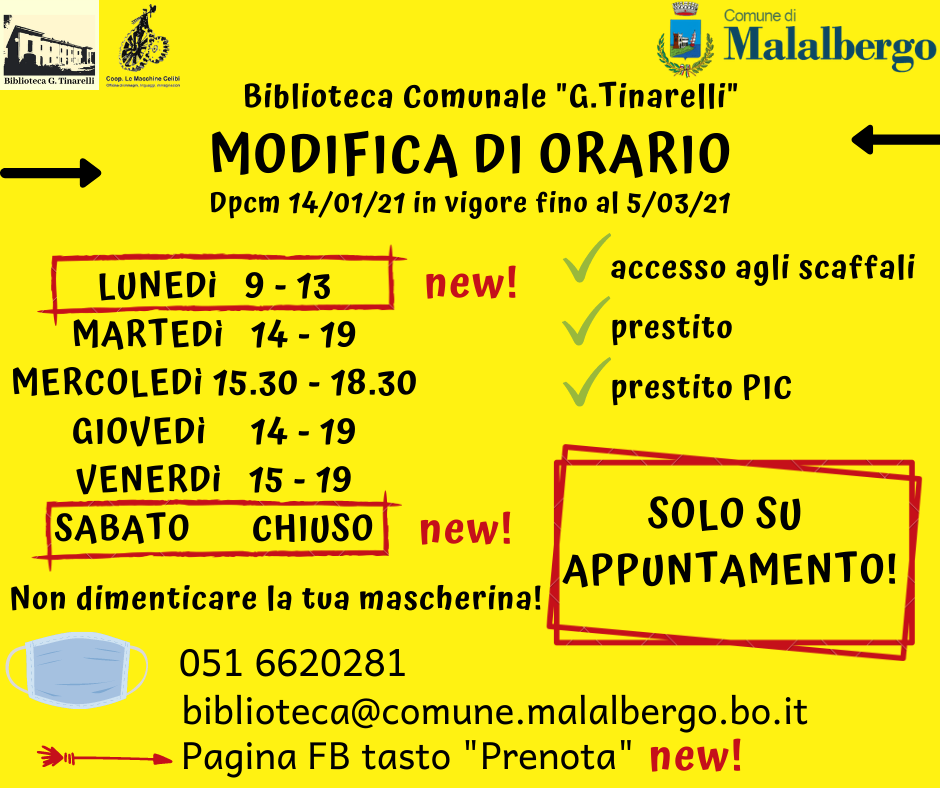 Si riceve solo su appuntamento tramite il numero telefonico 051 6620281, l'indirizzo mail biblioteca@comune.malalbergo.bo.it o il tasto PRENOTA sulla pagina facebook (nuovo)