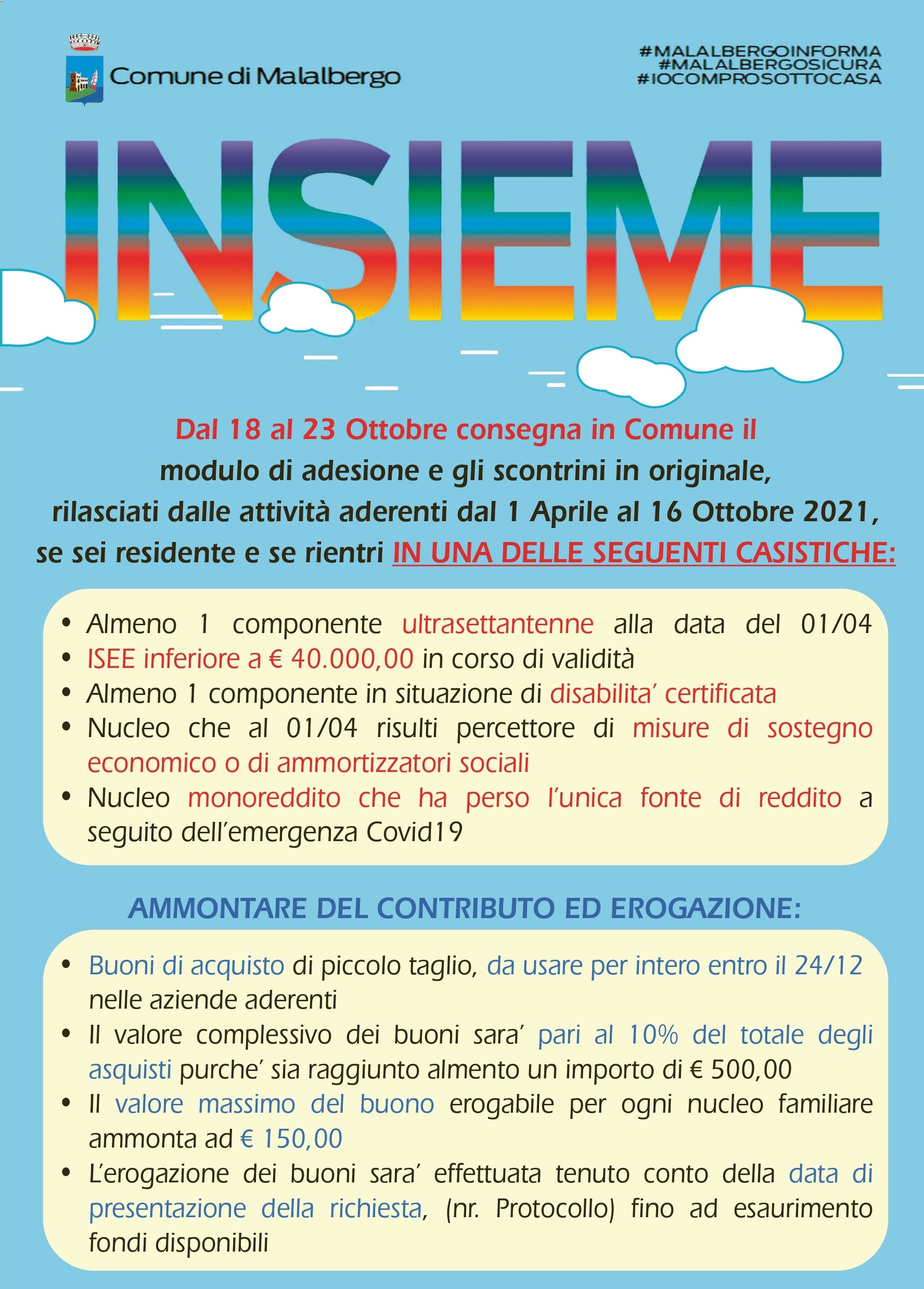 La domanda di contributo dovrà essere presentata a partire dal 18 fino al 23 ottobre in originale cartaceo, all'Ufficio Protocollo del Comune di Malalbergo.