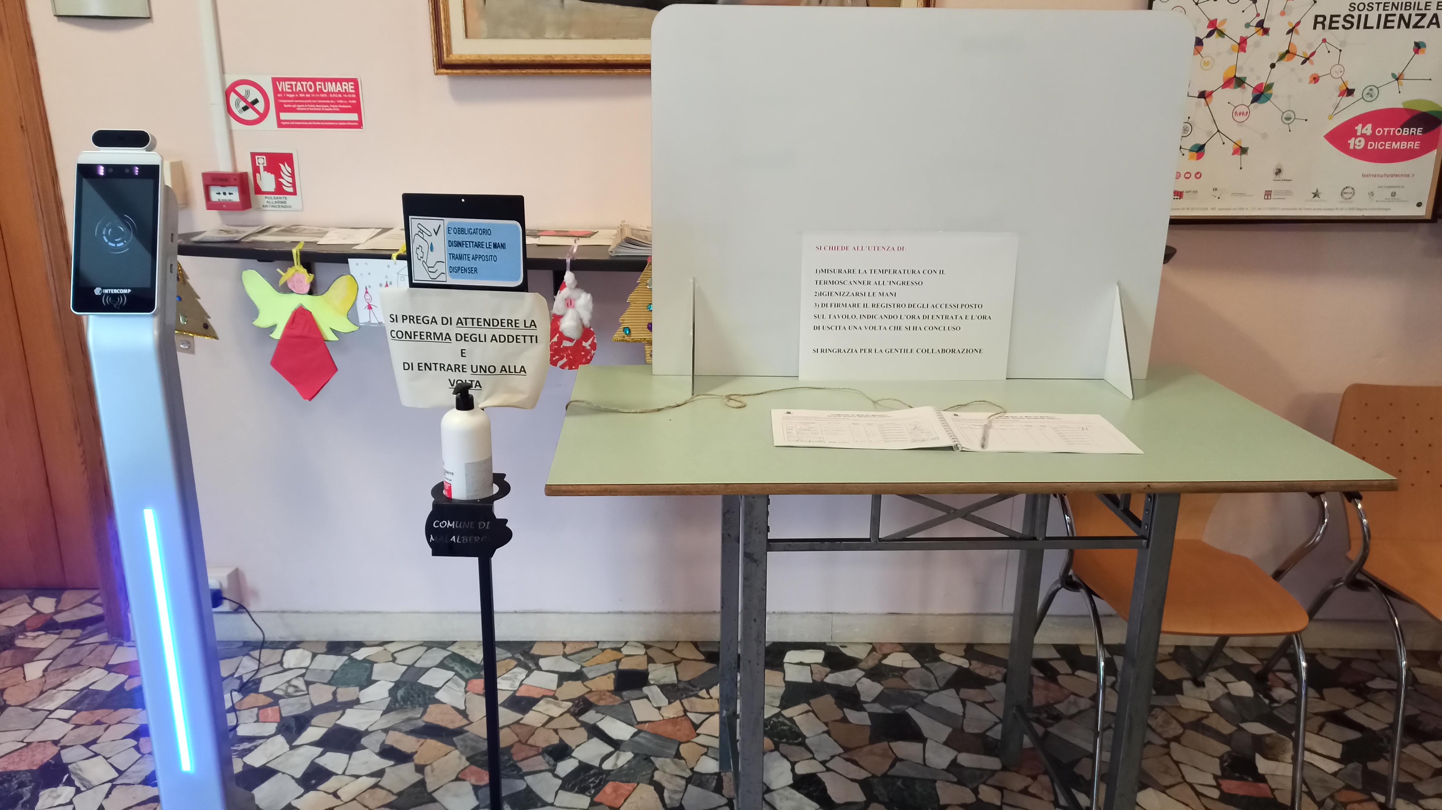 Per garantire la massima sicurezza sanitaria nell'accesso agli Uffici Pubblici è stata predisposta all'ingresso del Comune una postazione dotata di termoscanner a colonna, disinfettante e registro degli accessi.