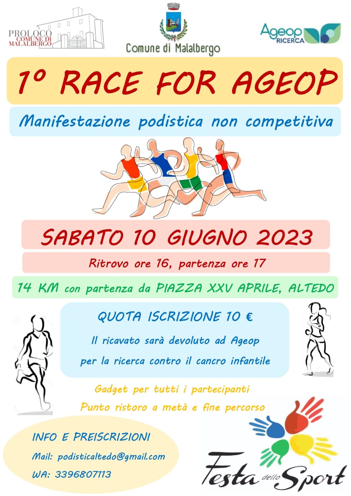 Alle 17 partirà la gara podistica Race for Ageop, 14 km da Altedo a Malalbergo e ritorno, e tutto il ricavato sarà devoluto in beneficenza.