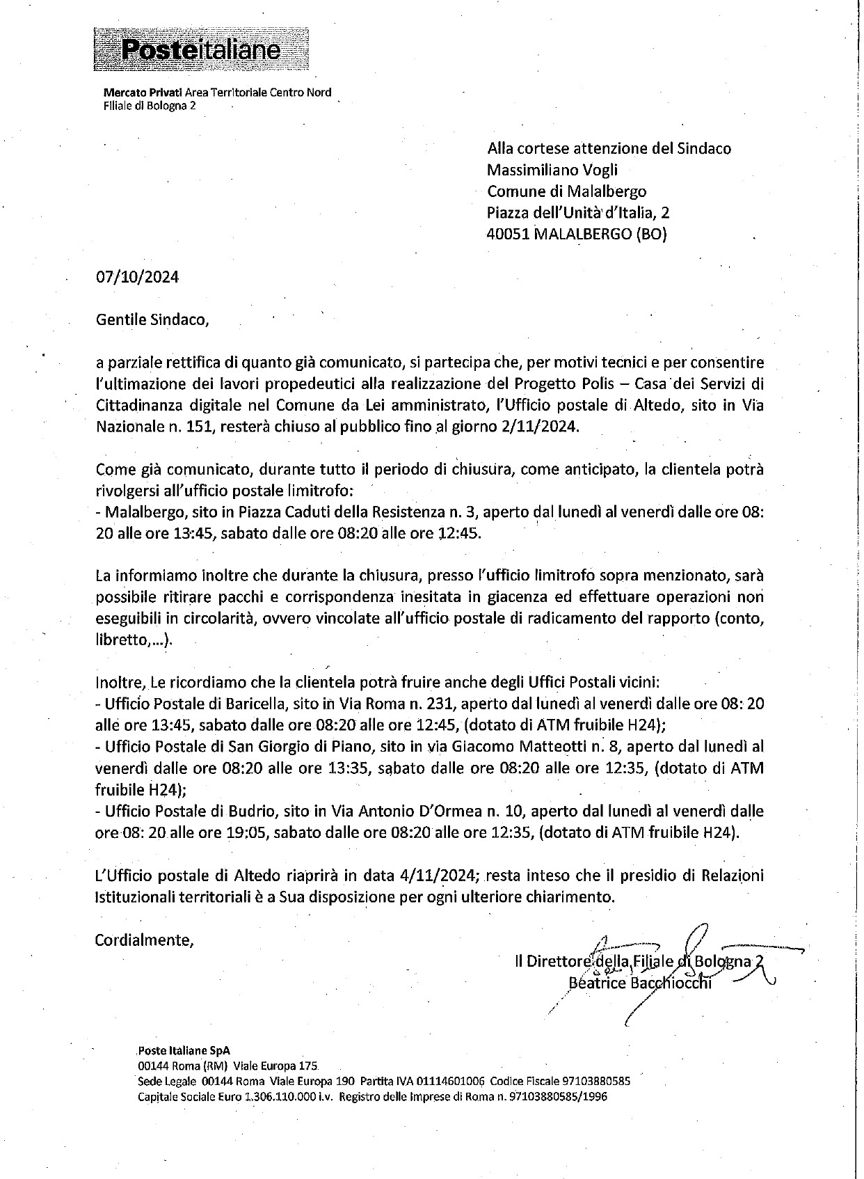Per motivi tecnici e per consentire l'ultimazione dei lavori propedeutici alla realizzazione del Progetto Polis l'Ufficio postale di Altedo resterà chiuso al pubblico fino al giorno 02/11/2024.