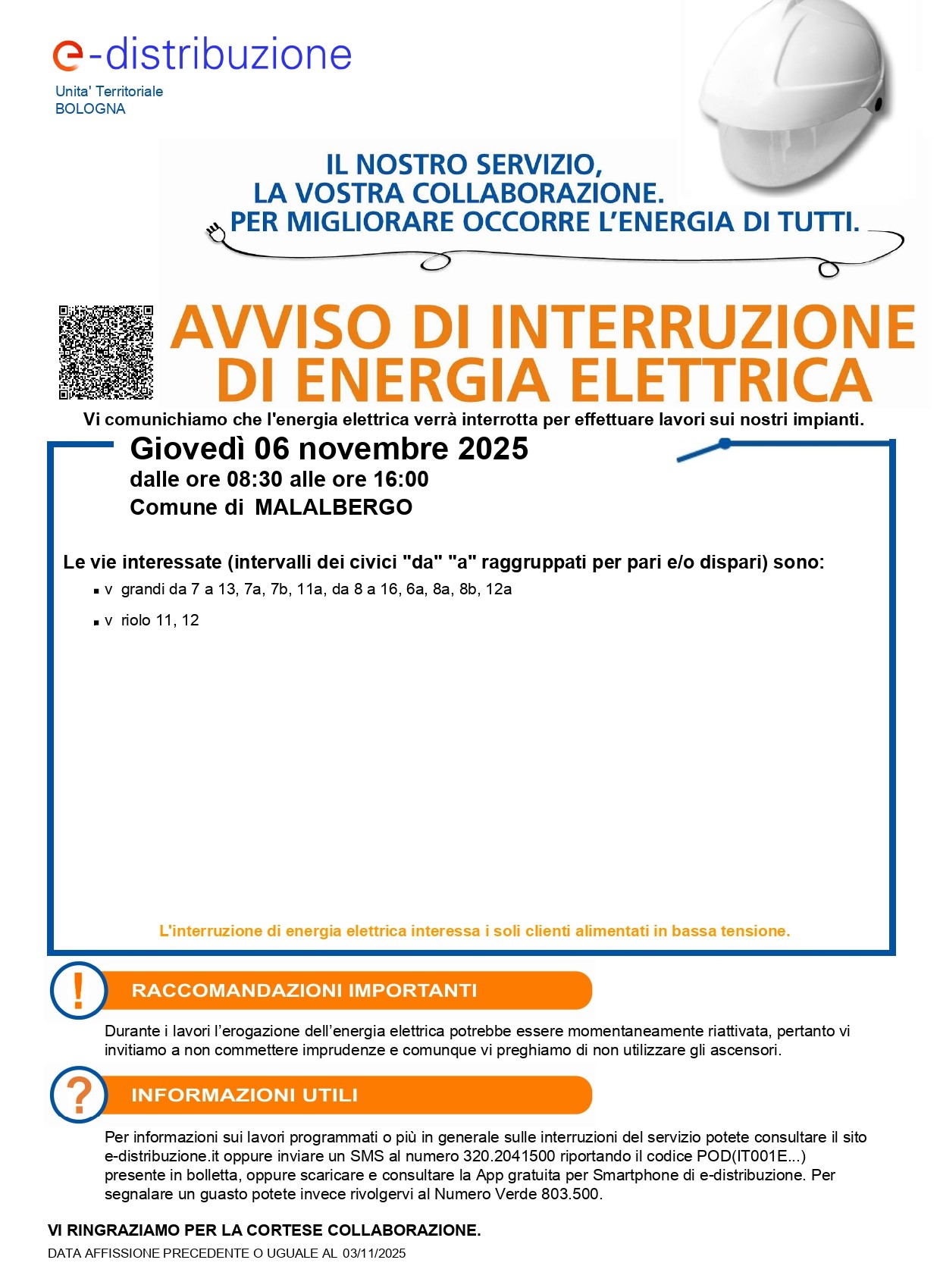 Nella giornata di Giovedì 06 novembre 2025 dalle ore 08:00 alle ore 16:00 si rende necessaria una interruzione dell'energia elettrica che coinvolgerà i clienti nelle vie e civici indicati nel volantino allegato.