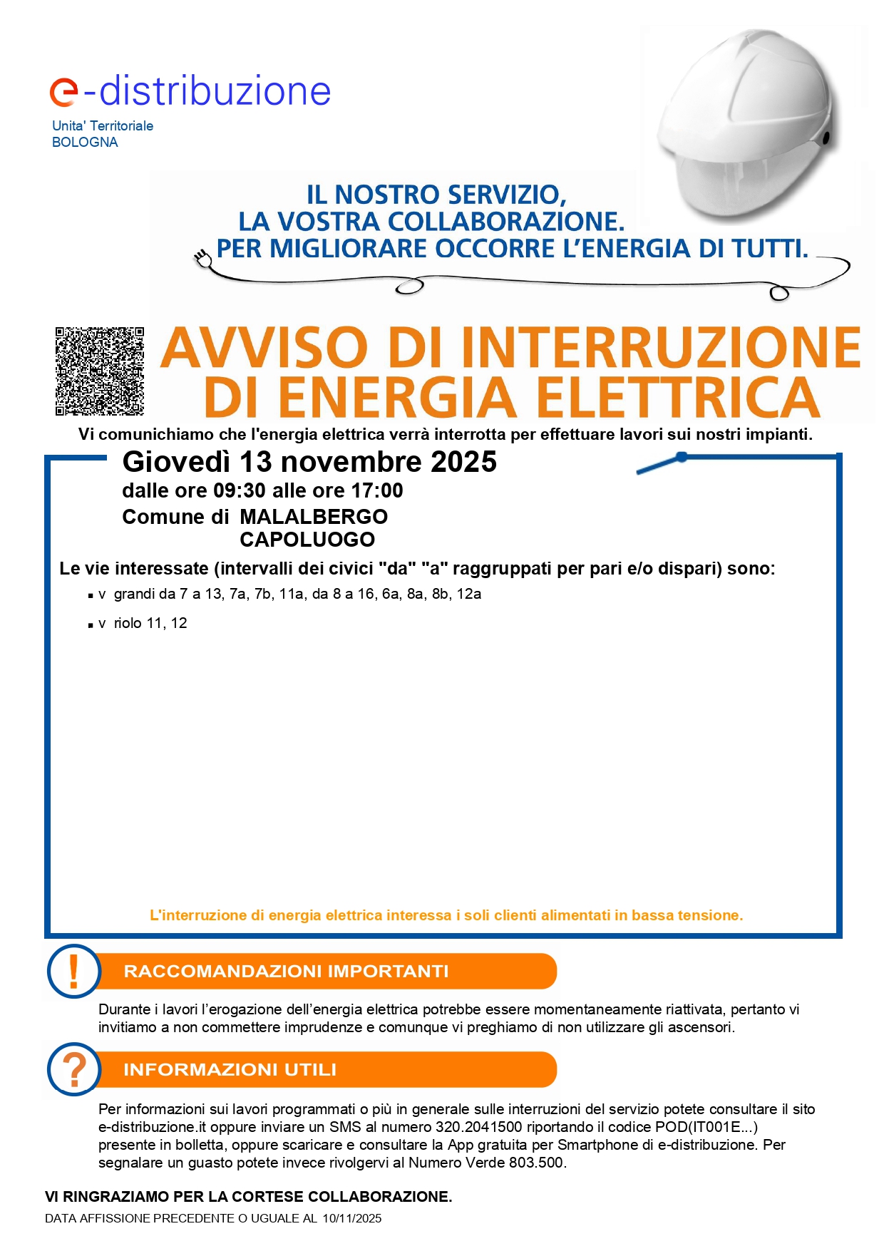 Nella giornata di Giovedì 13 Novembre 2025 dalle ore 09:30 alle ore 17:00 si rende necessaria una interruzione dell'energia elettrica che coinvolgerà i clienti nelle vie e civici indicati nel volantino allegato.