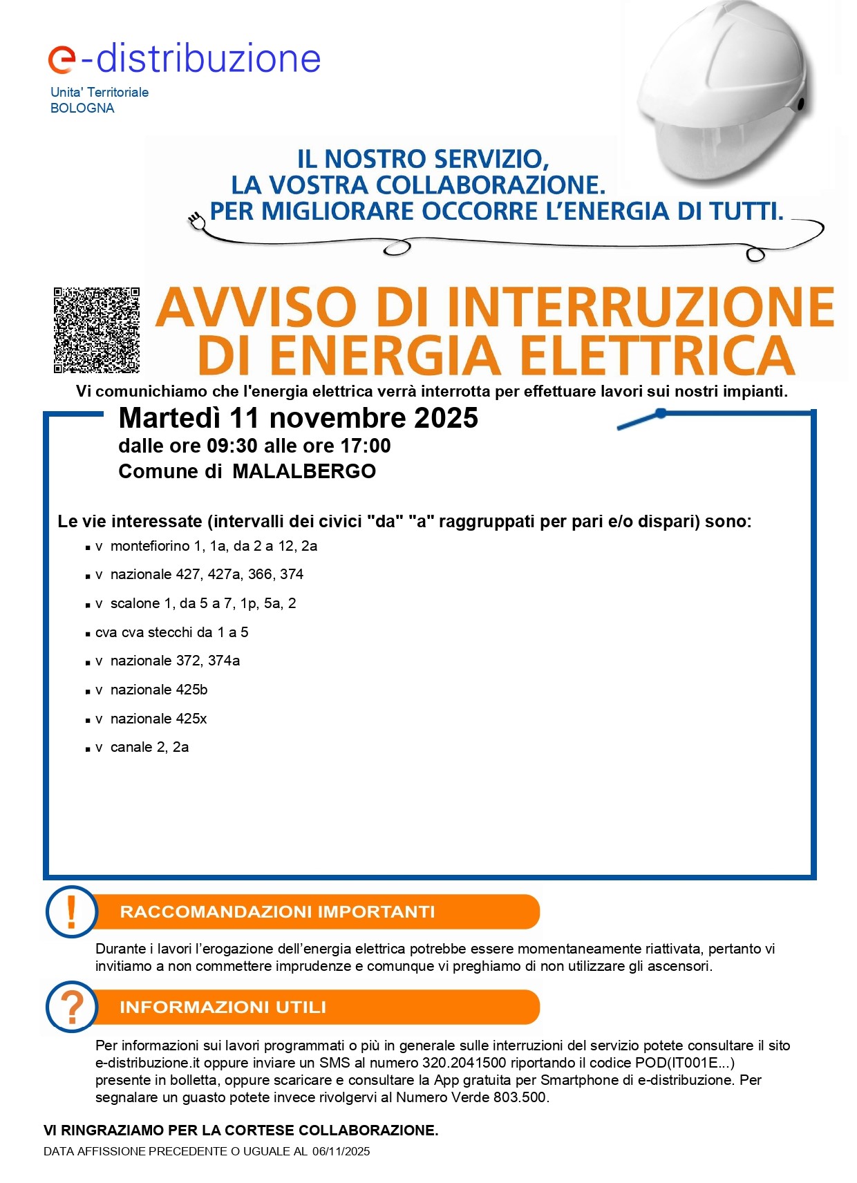 Nella giornata di Martedì 11 Novembre 2025 dalle ore 09:30 alle ore 17:00 si rende necessaria una interruzione dell'energia elettrica che coinvolgerà i clienti nelle vie e civici indicati nel volantino allegato.