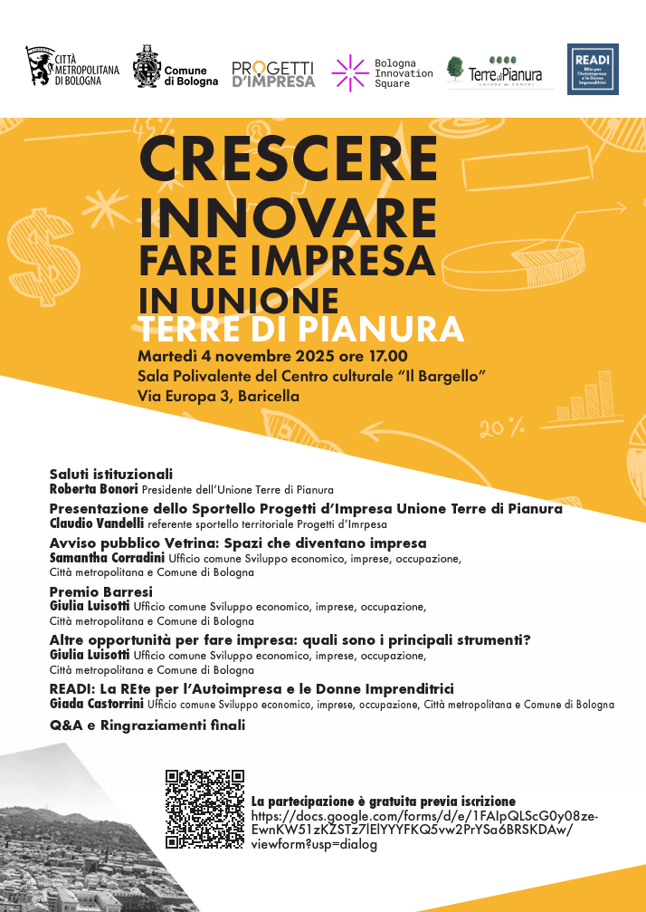 Lo sportello Progetti d’Impresa Unione Terre di Pianura, in collaborazione con l’Ufficio comune Sviluppo economico, imprese e occupazione di Città metropolitana e Comune di Bologna e insieme all'Unione Terre di Pianura, organizza un evento di diffusione e promozione dei servizi offerti dal servizio Progetti d’Impresa e degli strumenti di pianificazione per avviare una nuova impresa.