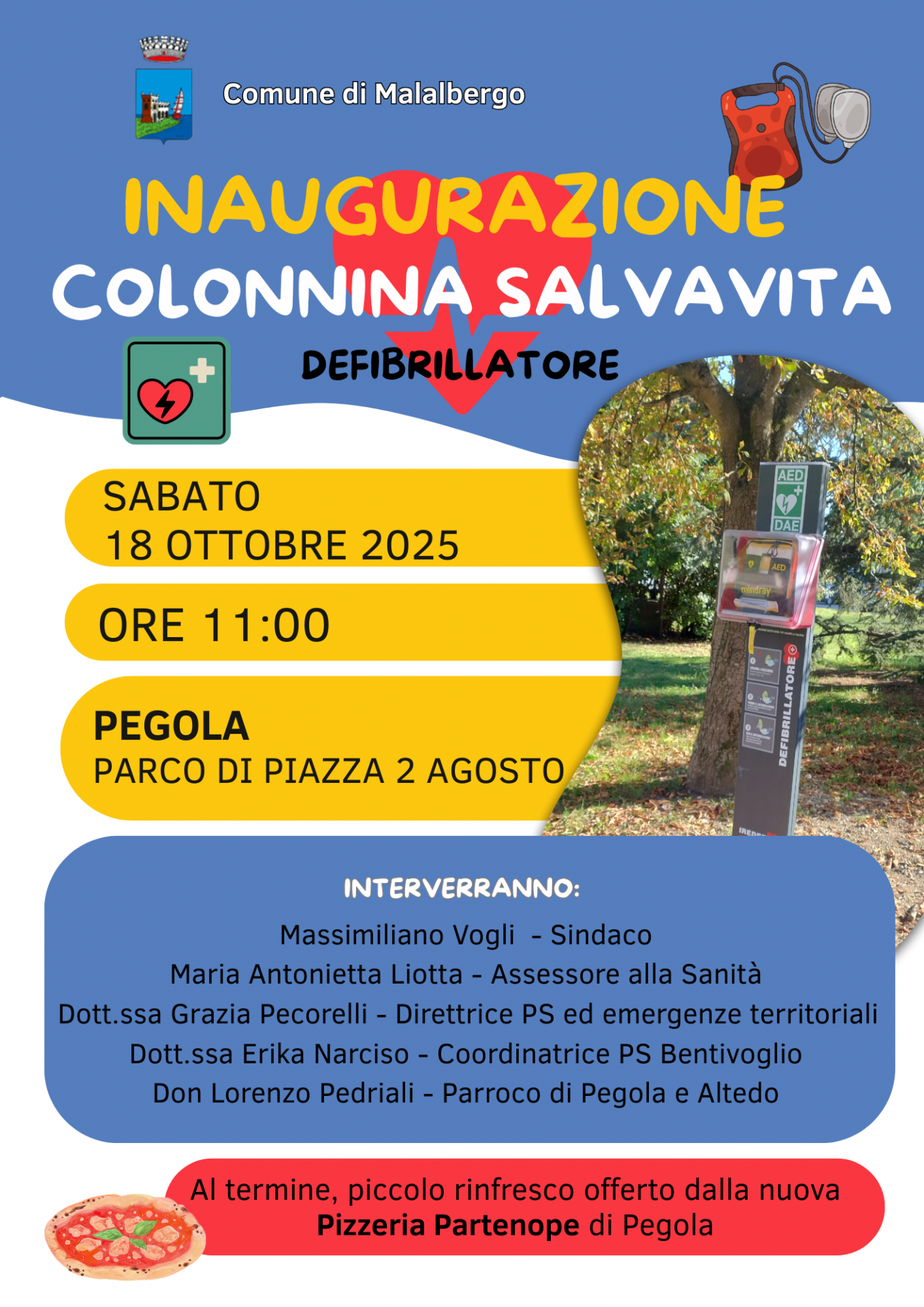 Ed è proprio nella settimana VIVA, che dal 13 al 19 ottobre sensibilizza la cittadinanza verso la cultura della rianimazione cardiopolmonare e del primo soccorso che Sabato 18 Ottobre alle ore 11:00 presso il Parco di Piazza 2 Agosto a Pegola ci sarà l’inaugurazione della colonnina salvavita (defibrillatore) con l’intervento di