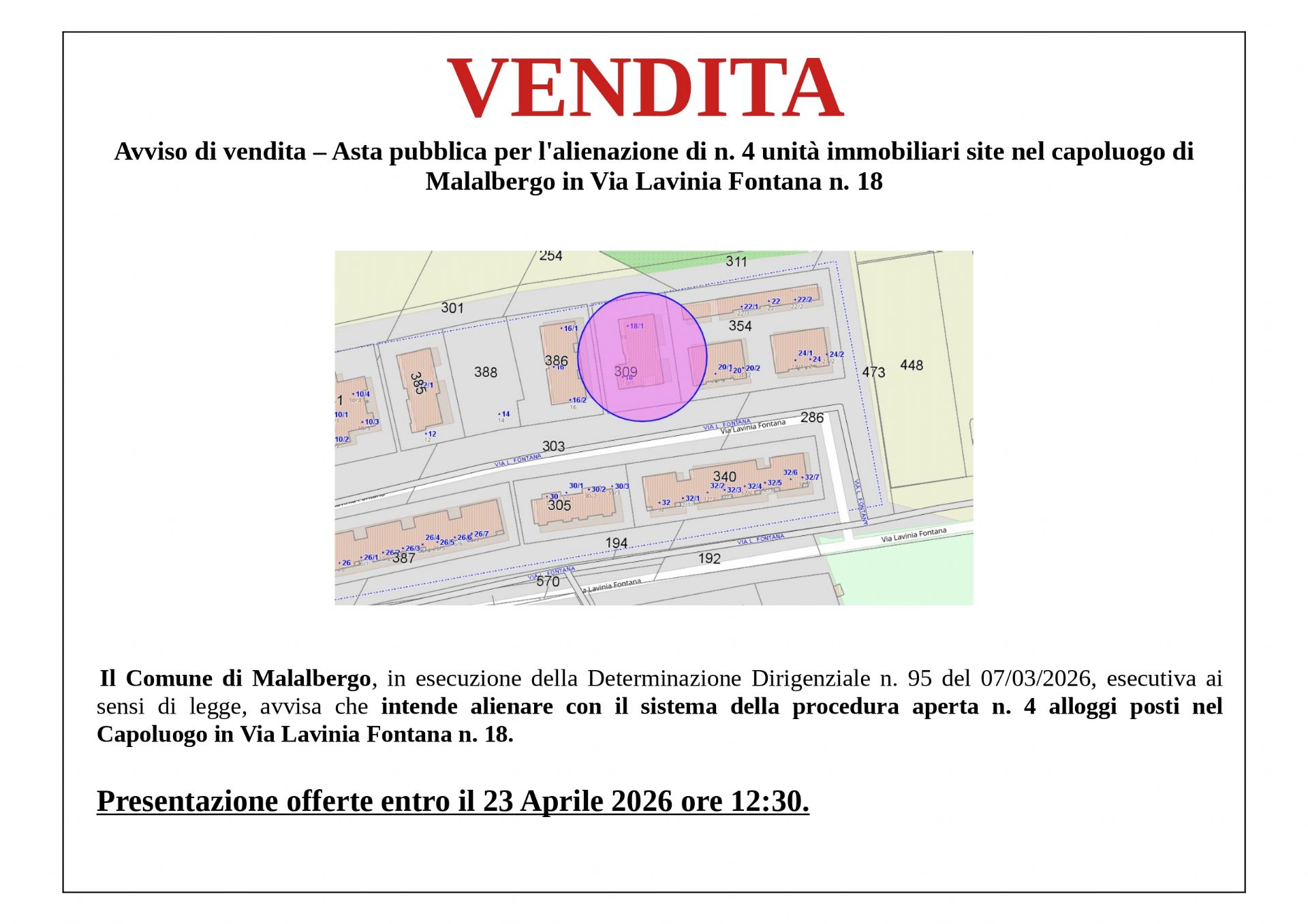 Il Comune di Malalbergo, in esecuzione della Determinazione Dirigenziale n. 95 del 07/03/2026, avvisa che intende alienare n. 4 unità immobiliari ad uso residenziale, site nel capoluogo, in Via Lavinia Fontana n. 18.