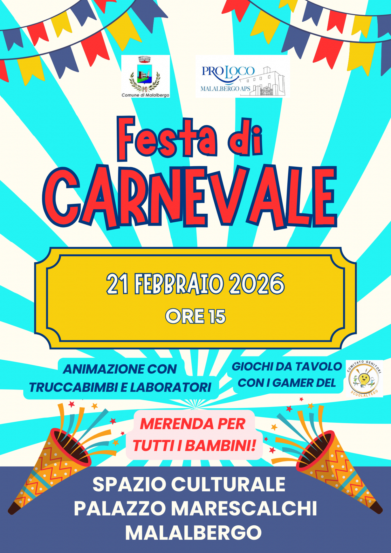 - La seconda festa è invece per domenica 21 febbraio, dalle ore 15:00 presso il nuovo Spazio Culturale di Palazzo Marescalchi, a Malalbergo. Ci saranno laboratori, animazione, truccabimbi e giochi da tavolo con i gamer del Comitato Genitori ScuolAltedo. Anche qui la merenda sarà offerta a tutti i bambini.