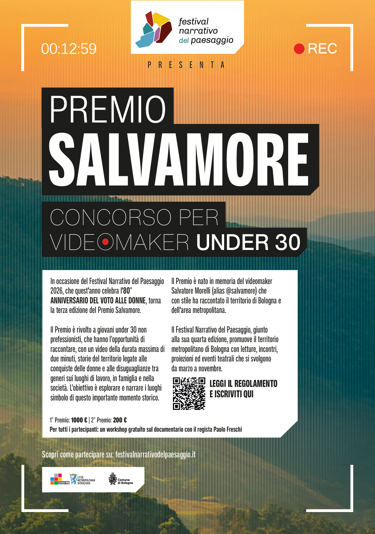 Anche quest'anno, nell'ambito del Festival Narrativo del Paesaggio, torna il Premio Salvamore, a ricordo di Salvatore Morelli, alias @salvamore, che per molti anni ha lavorato per Città metropolitana di Bologna contribuendo a raccontare il territorio metropolitano con passione, ricercatezza e uno stile espressivo innovativo.