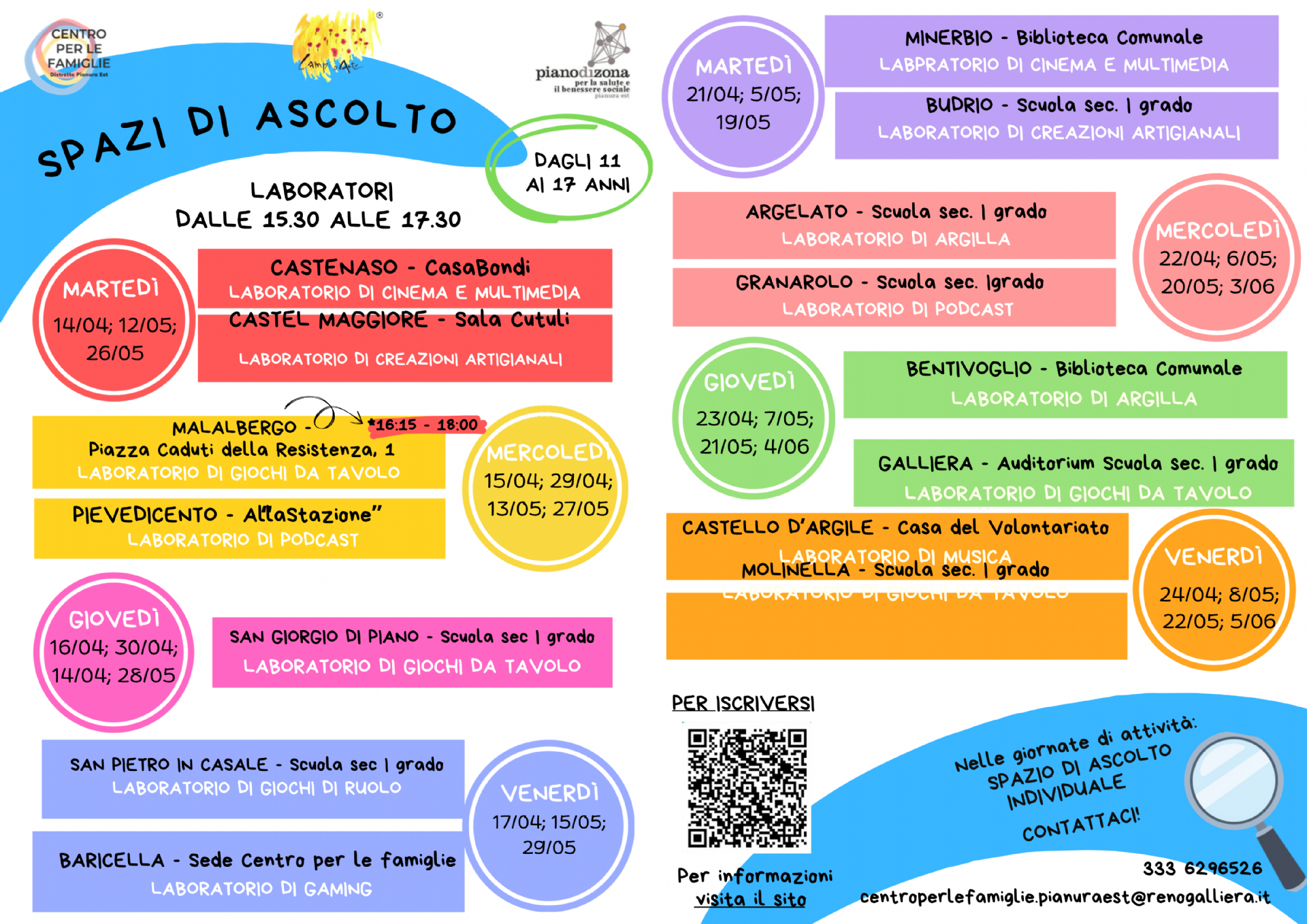 Tra gli allegati trovate un volantino, denominato "Centro per le Famiglie DPE_Spazi di ascolto_apr-giu26", che racchiude le attività su tutti e 15 i Comuni del Distretto, e un volantino dedicato per ciascuna sede.