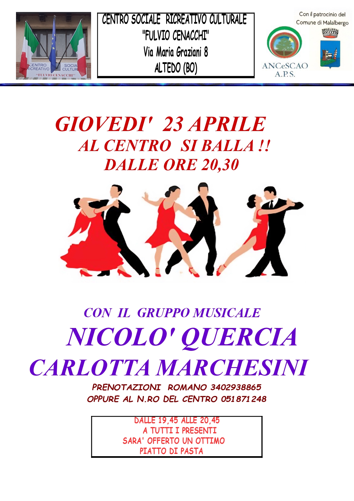 Al Centro si balla! Serata danzante con il Gruppo MusicaleNicolò Quercia Carlotta Marchesini Dalle ore 19:45 alle 20:45 a tutti i partecipanti verrà offerto un piatto di ottima pasta al Centro Sociale Ricreativo Culturale "Fulvio Cenacchi", Via M...