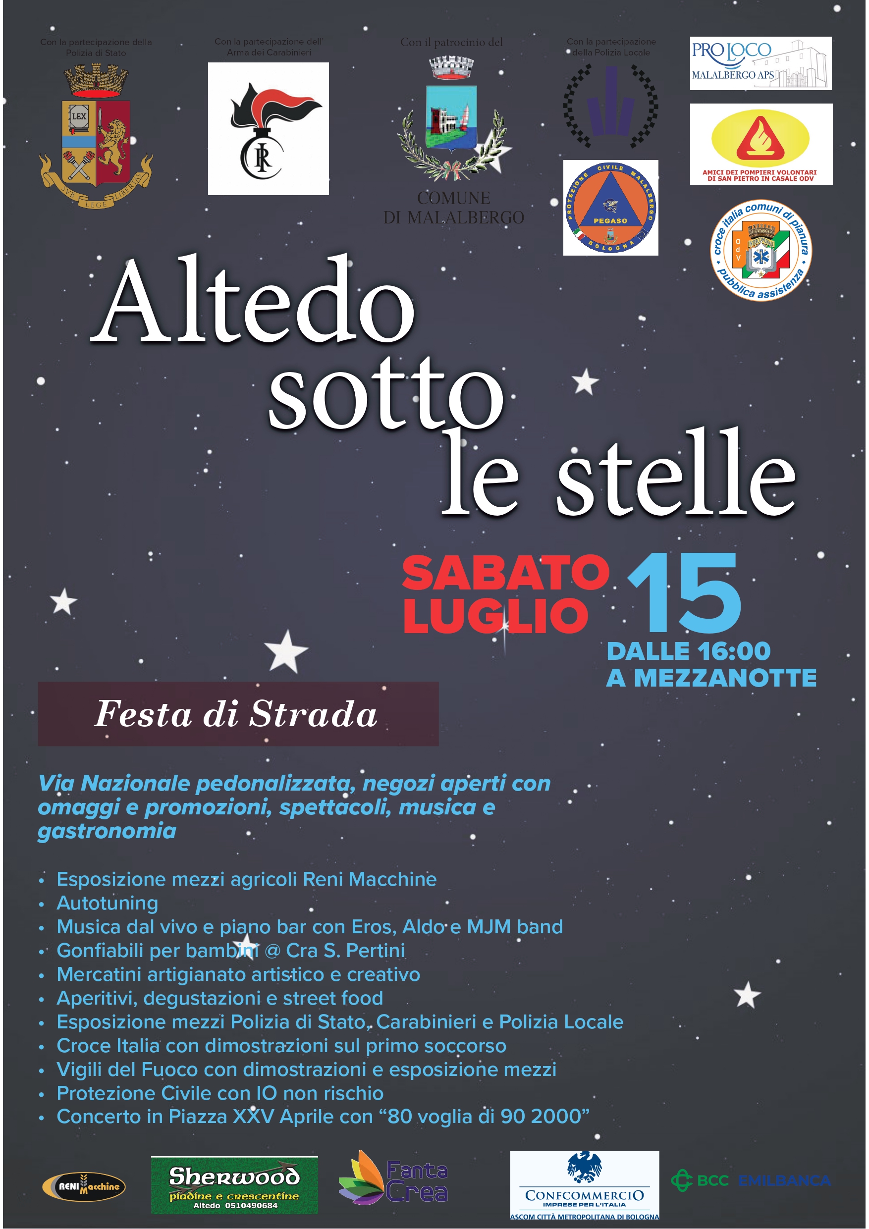 Sabato 15 Luglio dalle 16:00 a mezzanotte "Altedo Sotto le Stelle" la festa di strada organizzata dalla Proloco di Malalbergo, con la collaborazione dei commercianti e la partecipazione delle associazioni locali.