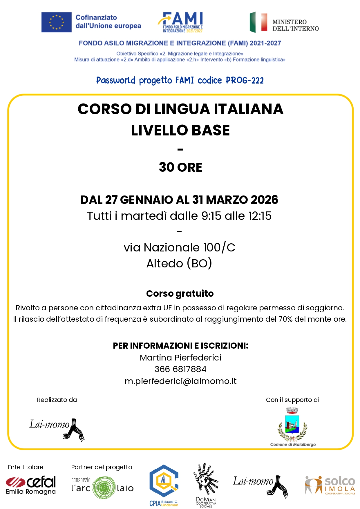 Per informazioni e iscrizioni: Martina Pierfederici m.pierfederici@laimomo.it cell.366/6817884