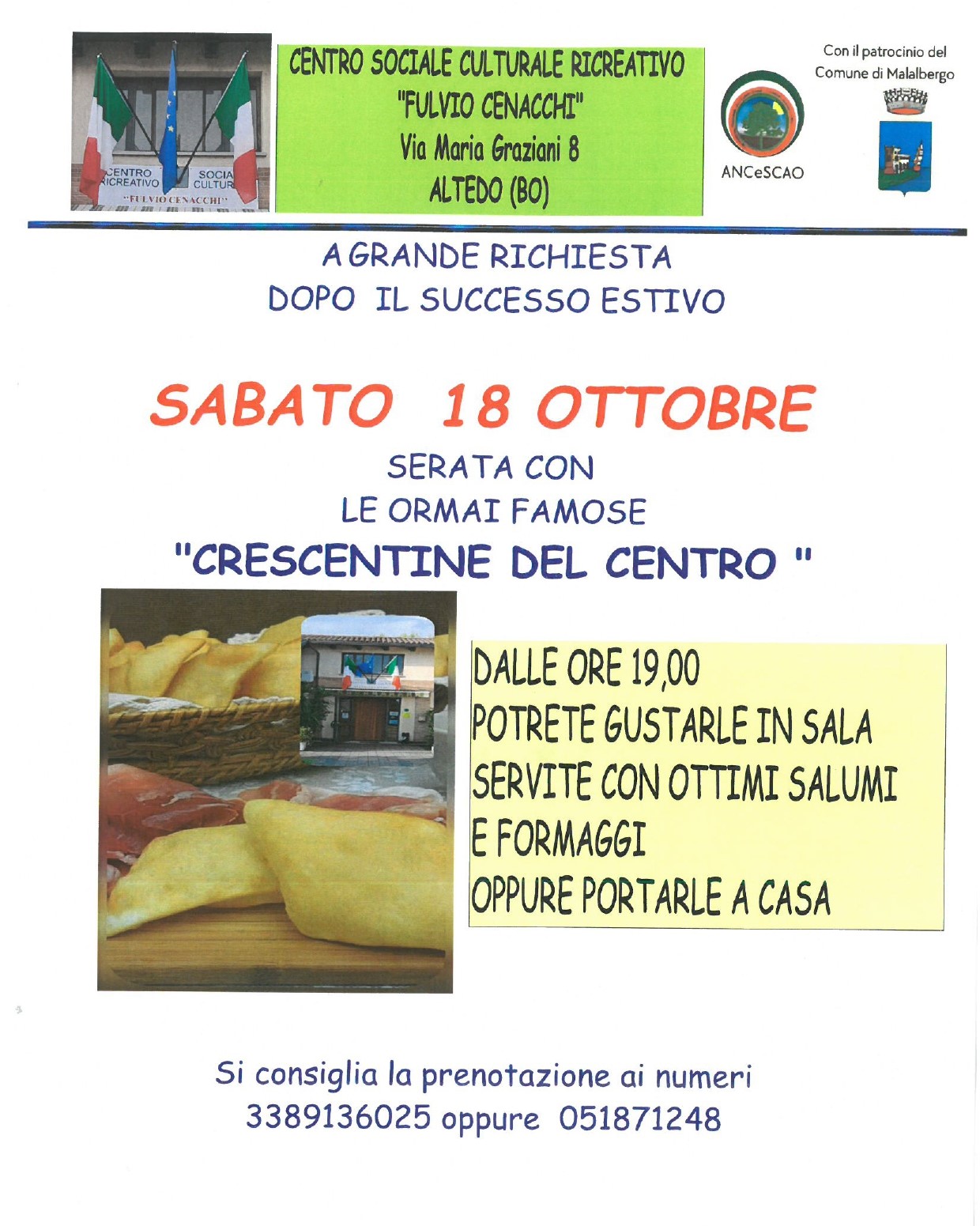 Serata con crescentine da asporto o da gustare presso il Centro Sociale Ricreativo Culturale "Fulvio Cenacchi"