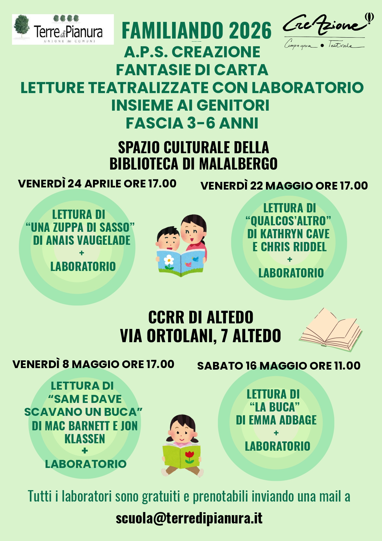 Tutti i laboratori sono gratuiti e prenotabili inviando una mail a : scuola@terredipianura.it